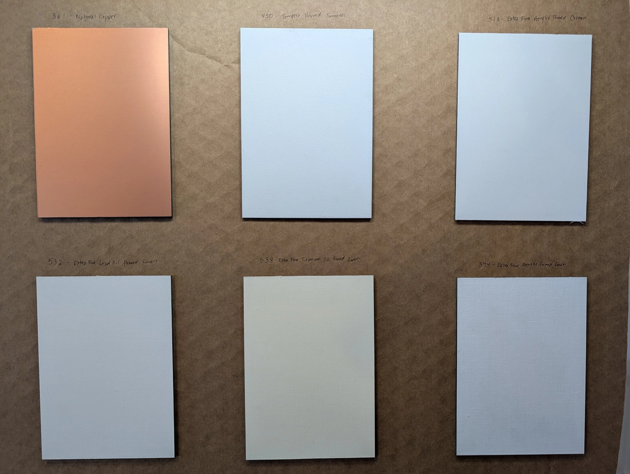 Clockwise from top left: 361, 450, 513, 532, 538, and 574 Artefex 5”x7” panel surface preference testing