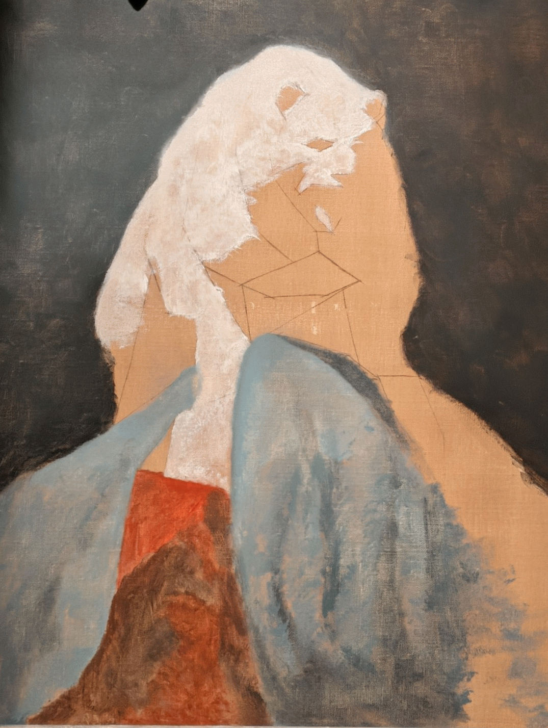 Turquoise Blue Light + Ivory Black makes a very satisfying dark electric blue and a light blue highly chromatic palette addition was required to maintain chroma in the lighter sections of fabric. Ultramarine Blue + Lead White yielded an unsatisfying low chroma light value blue.