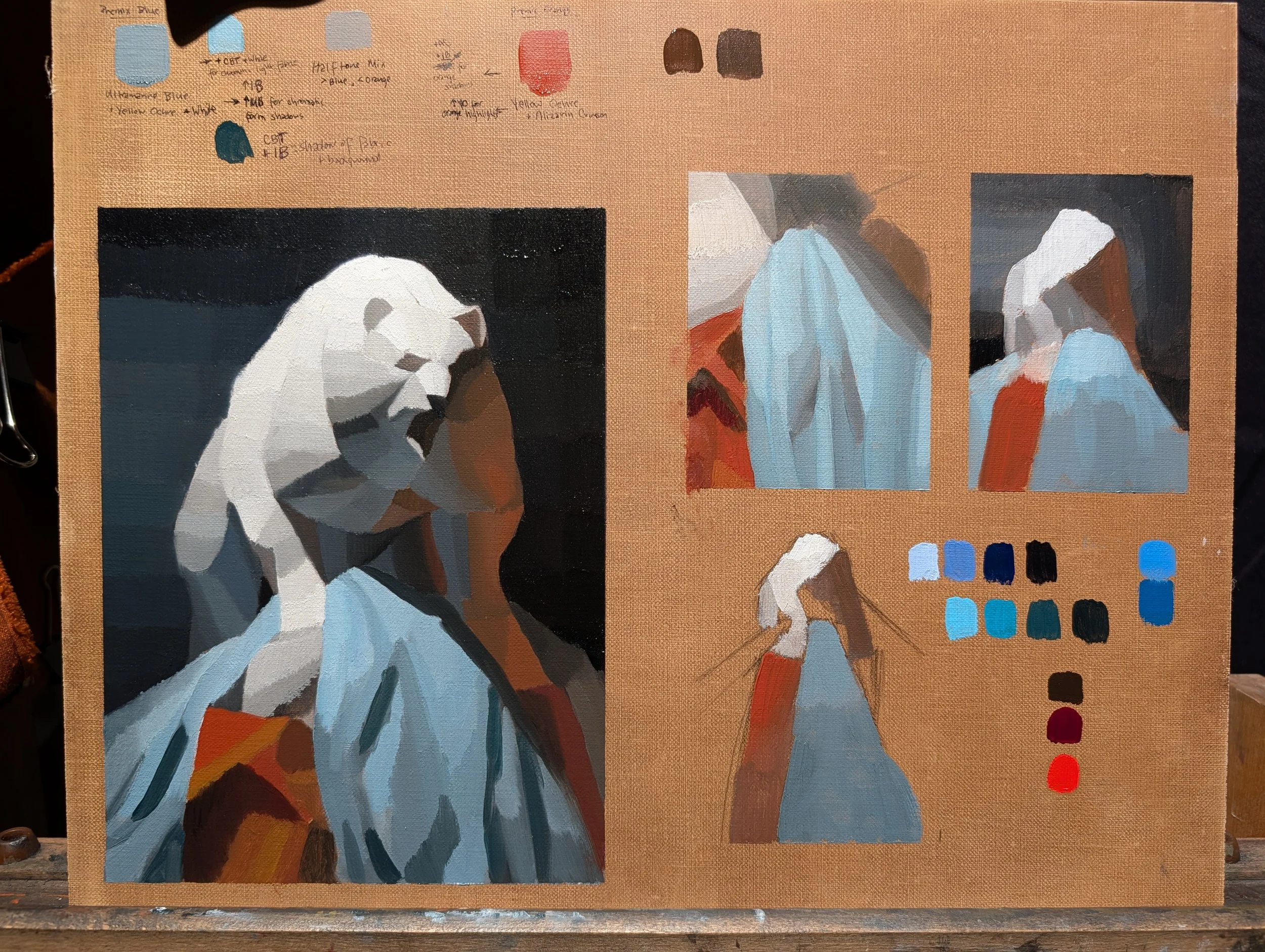 Color and Value Studies. Required Cobalt Bright Turquoise palette addition to achieve desired effect of high chroma light blue for parts of fabric